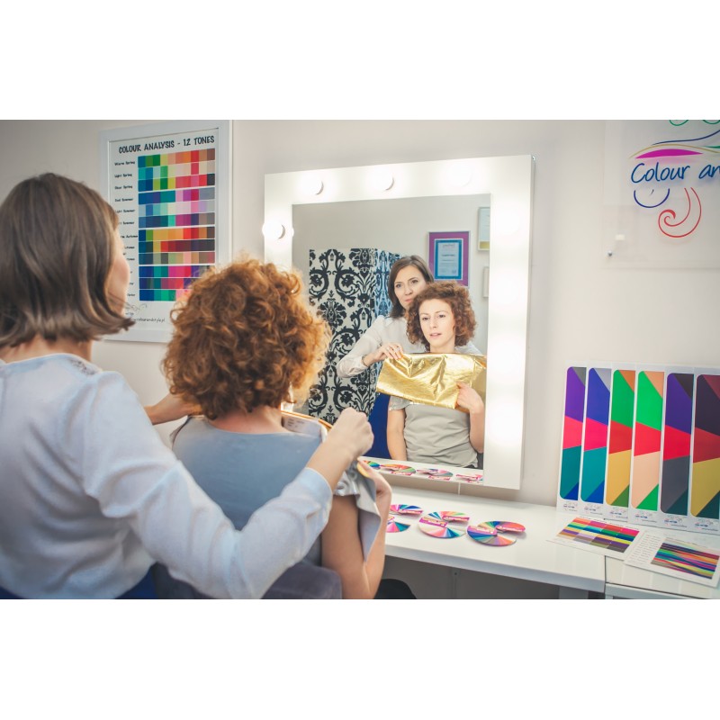 o wymiarze ok. 30x50cm - przyłożone do osoby analizowanej zakrywają dekolt i ramiona, dzięki czemu możemy zaobserwować wpływ barwy chusty na wygląd skóry / oczu / ust;