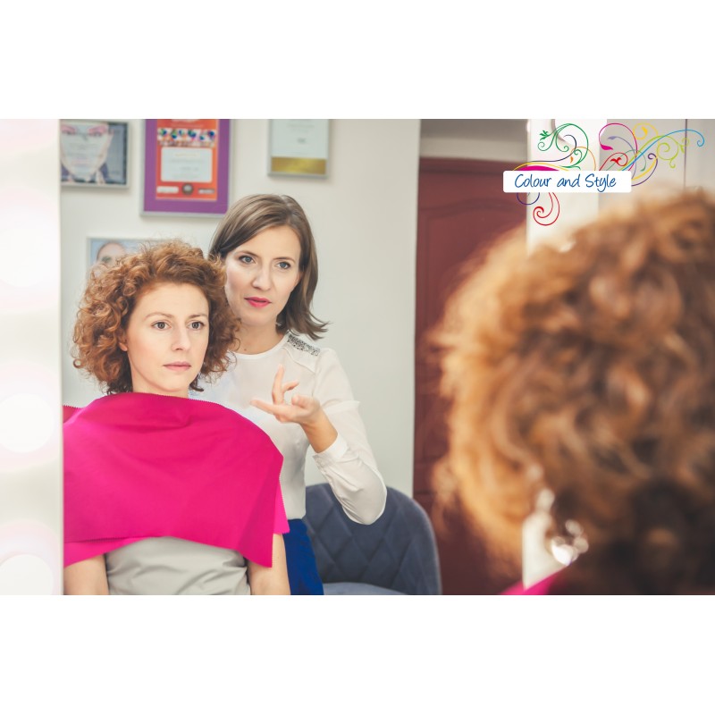 o wymiarze ok. 30x50cm - przyłożone do osoby analizowanej zakrywają dekolt i ramiona, dzięki czemu możemy zaobserwować wpływ barwy chusty na wygląd skóry / oczu / ust;