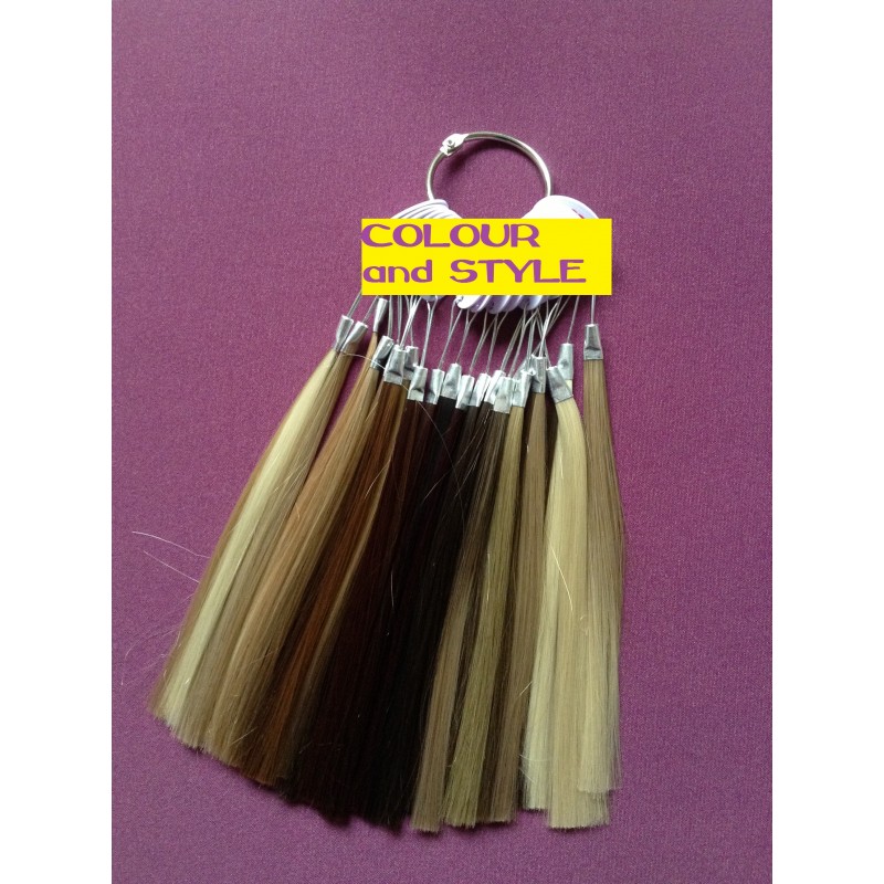 Wzornik to 24 pasemek włosów syntetycznych o długości ok. 15 cm.