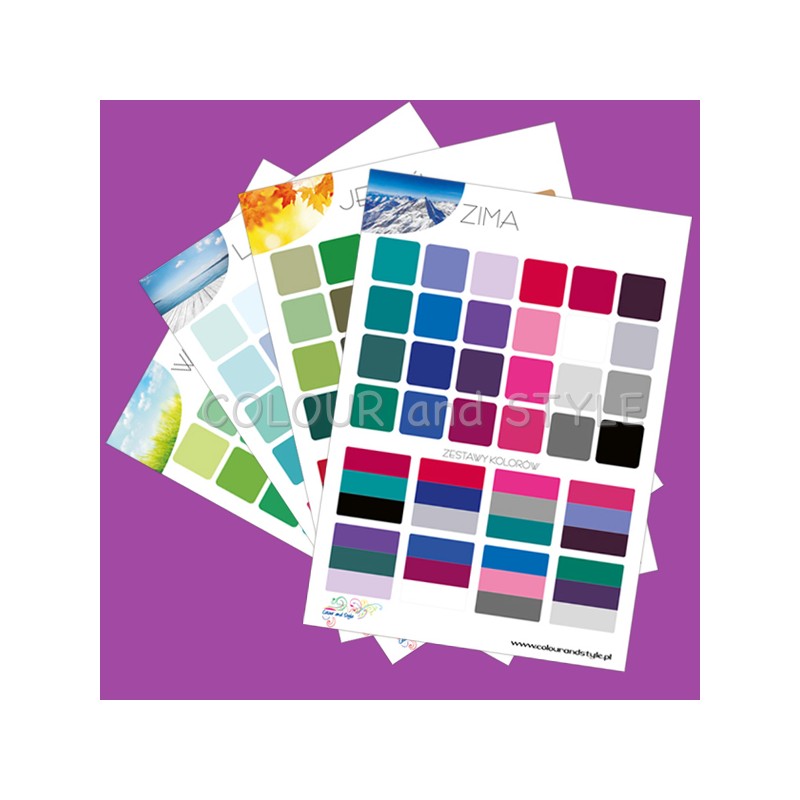 - dodatkowo przedstawia 8 przykładowych zestawów kolorystycznych (po 3 kolory w każdym) - mogą to być sposoby łączenia kolorów ubrań, dodatków lub makijażu;