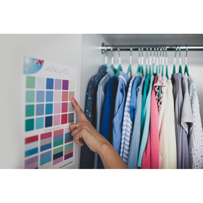 - dodatkowo przedstawia 8 przykładowych zestawów kolorystycznych (po 3 kolory w każdym) - mogą to być sposoby łączenia kolorów ubrań, dodatków lub makijażu;