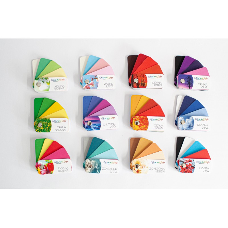 Jasna Wiosna, Ciepła Wiosna, Czysta Wiosna, Jasne Lato, Chłodne Lato, Zgaszone Lato, Ciemna Jesień, Ciepła Jesień, Zgaszona Jesień, Ciemna Zima, Chłodna Zima, Czysta Zima.